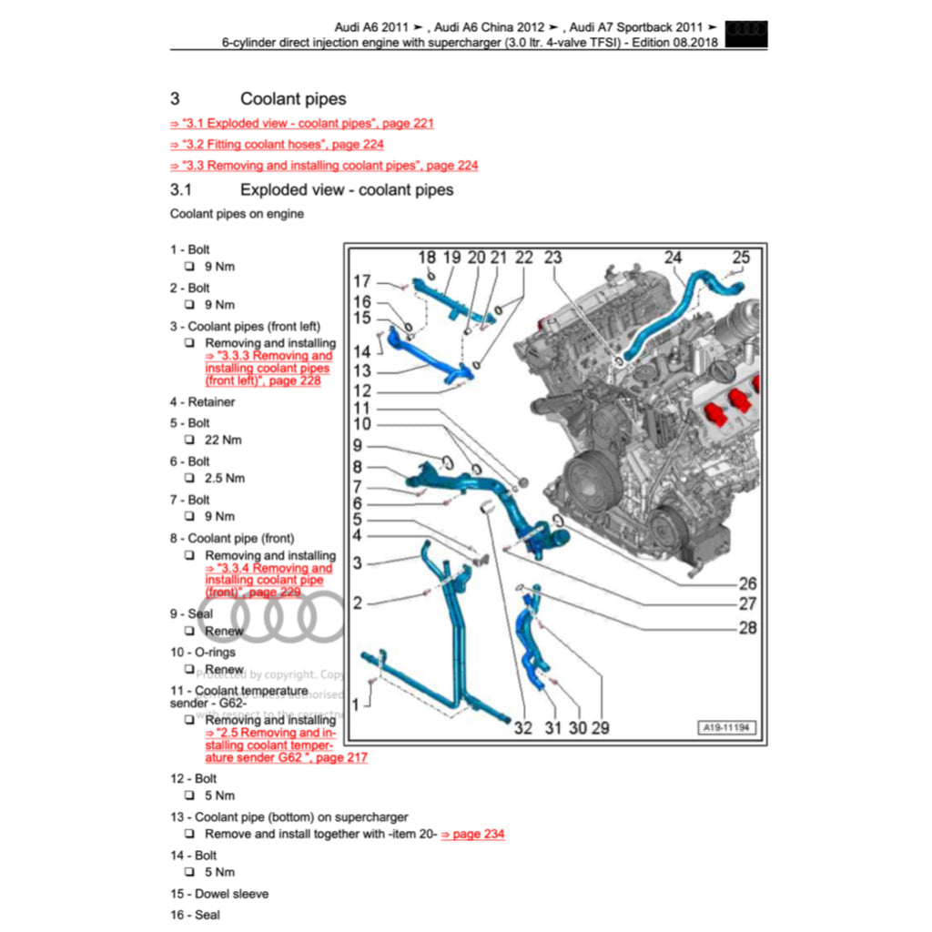 ENGINE FEATURED IN THIS MANUAL: 1.8 L I4 TFSI, 2.0 L I4 TFSI, 2.5 L V6 FSI; 2.8 L V6 FSI; 3.0 L V6 TFSI; 4.0 L V8 TFSI; 2.0L l4 TDI; 3.0 L V6 TDI