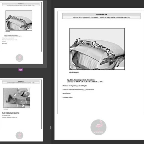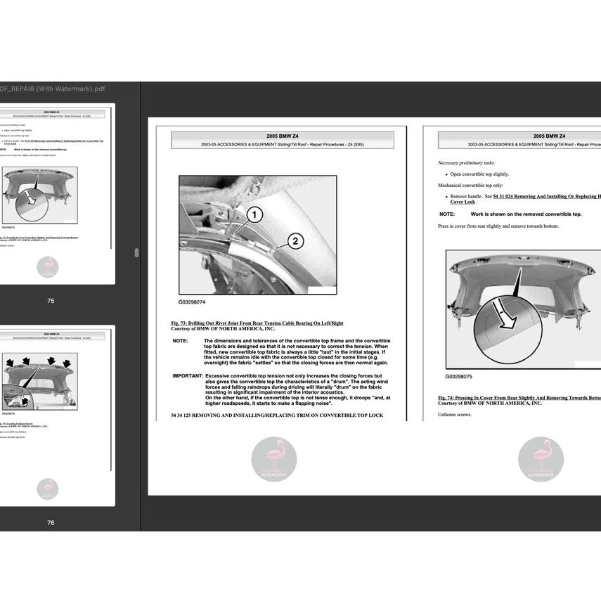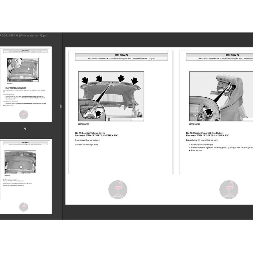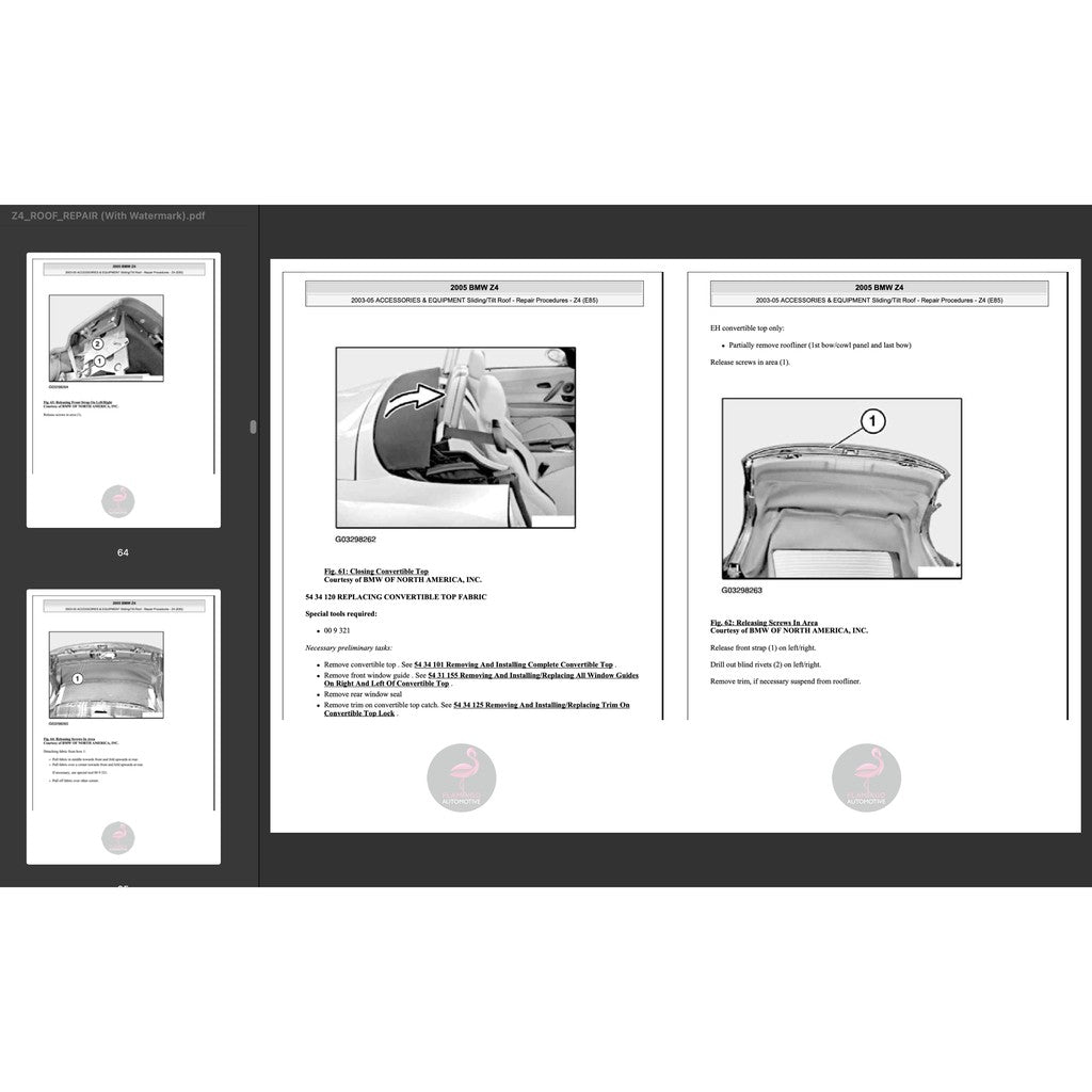 A must have for BMW workshop operatives and Z4 owners who know better what headache it could be to track down a squeaking seal, water ingress or hydraulic system failure. This manual goes in-depth into service and repair information for the Z4 E85 convertible top system: Gap adjustment, canvas repair, micro switch, lubrication, hydraulics, you name it. It is riddled with closeups pictures and pointers.