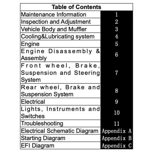 This is a comprehensive workshop manual for both technicians and DIY bike mechanic. This manual will help you restore, repair and maintain your CFMOTO just like professional mechanic. Very easy step by step instructions with hundreds of diagrams and schematics. Covers all aspects of the bike from engine to suspension, wheels, fuel supply, electrical and trouble shooting tips. If you can fix a Matchbox, with this manual you can fix your CFMOTO A to Z.