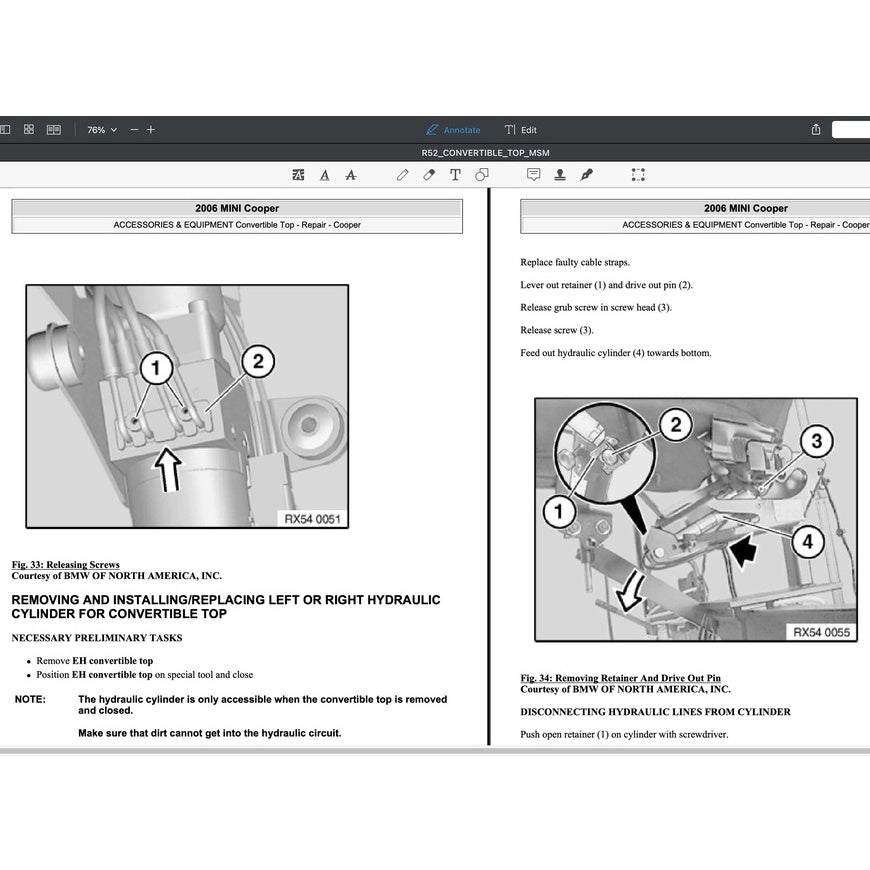 A must have for workshop operatives and MINI R52 owners who know better what headache it could be to track down a squeaking seal, water ingress or hydraulic system failure. This manual goes in-depth into maintenance, service and repair information for the MINI R52 convertible top system: Gap adjustment, calibration, pesky micro-switch & sensors test, lubrication, hydraulics, you name it.