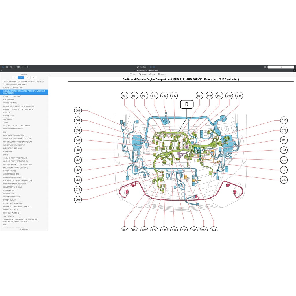 Complete wiring diagram for Toyota Alphard/Vellfire covering engine 2AR-FE/2GR-FE/2GR-FKS. This manuals include: