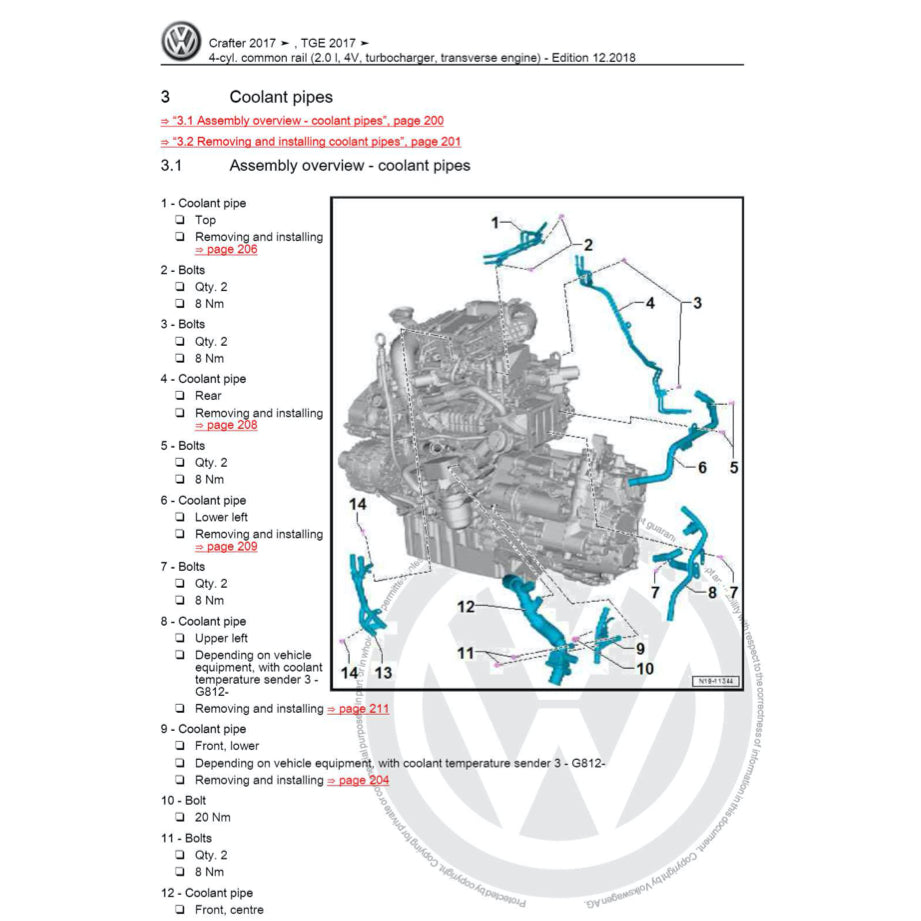 The manual covers VW CRAFTER with engine 2.0L and 2.5L Diesel. It is designed for seasoned mechanics given the high level of details and procedures involved. It goes in the smallest details of the CRAFTER maintenance, servicing, repair, and trouble shooting and fault finding. It is riddled with high resolution graphic pictures and diagrams, charts and tables for easy reference.