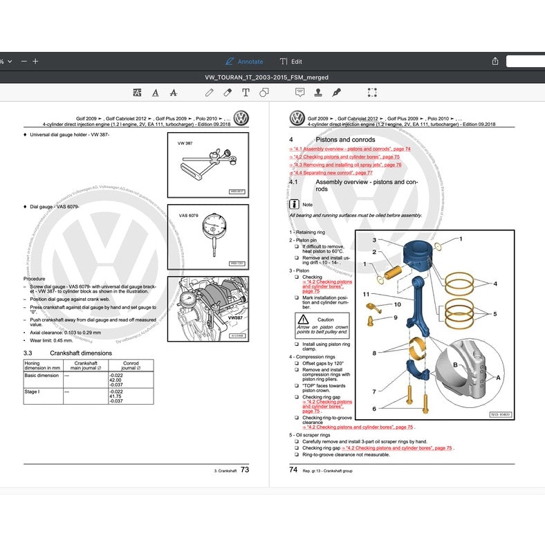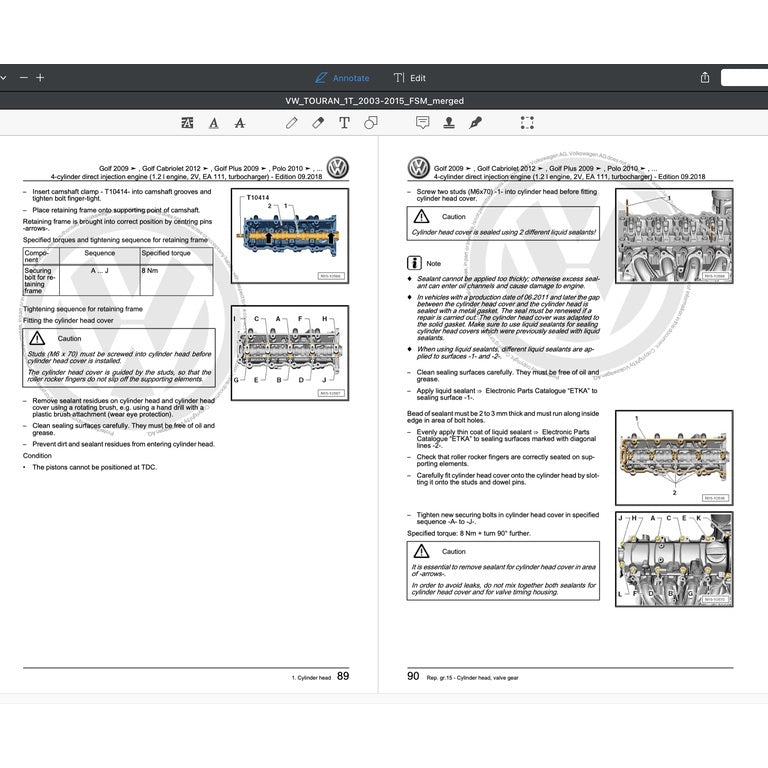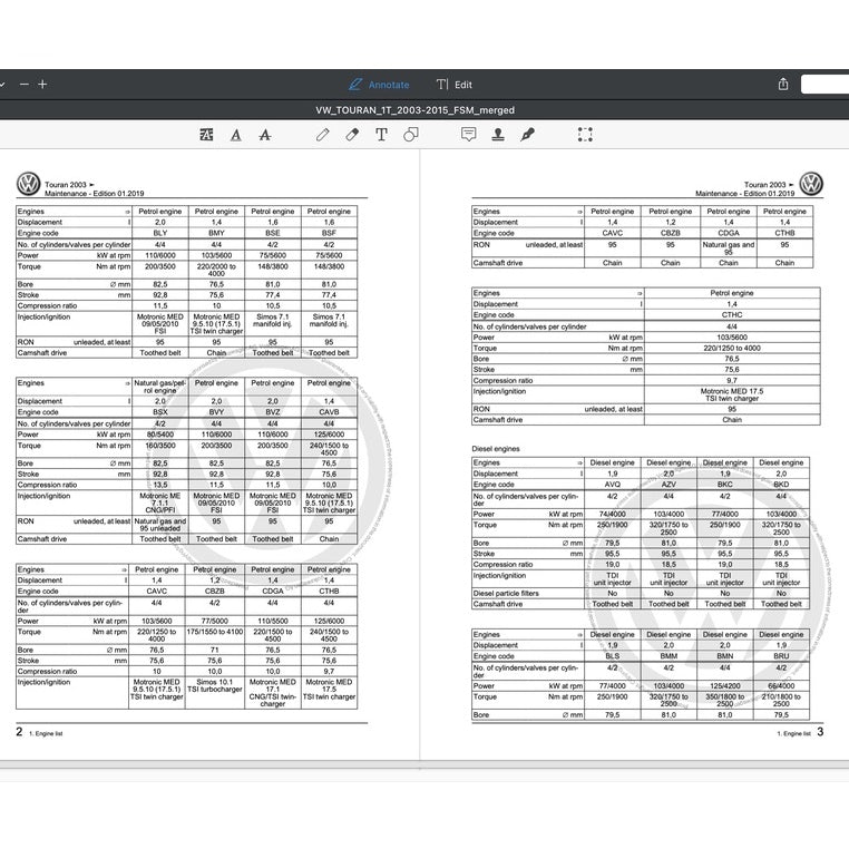 The manual covers VW TOURAN with petrol engine 1.2L, 1.4L, 1.6L and 2.0 L including turbocharged and supercharged engines.. It is designed for seasoned mechanics given the high level of details and procedures involved. It goes in the smallest details of the Touran maintenance, servicing, repair, and trouble shooting and fault finding. It is riddled with high resolution graphic pictures and diagrams, charts and tables for easy reference.